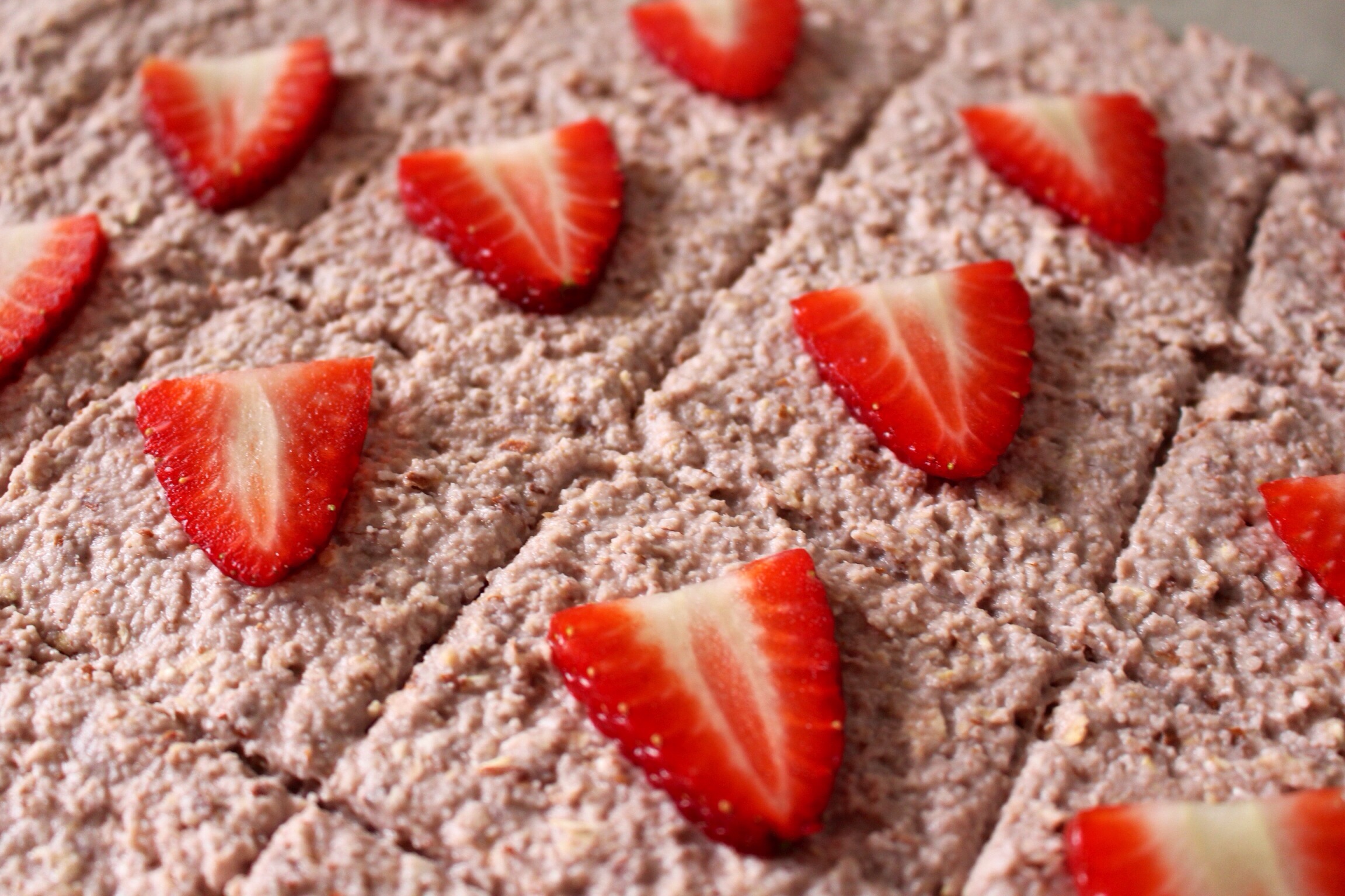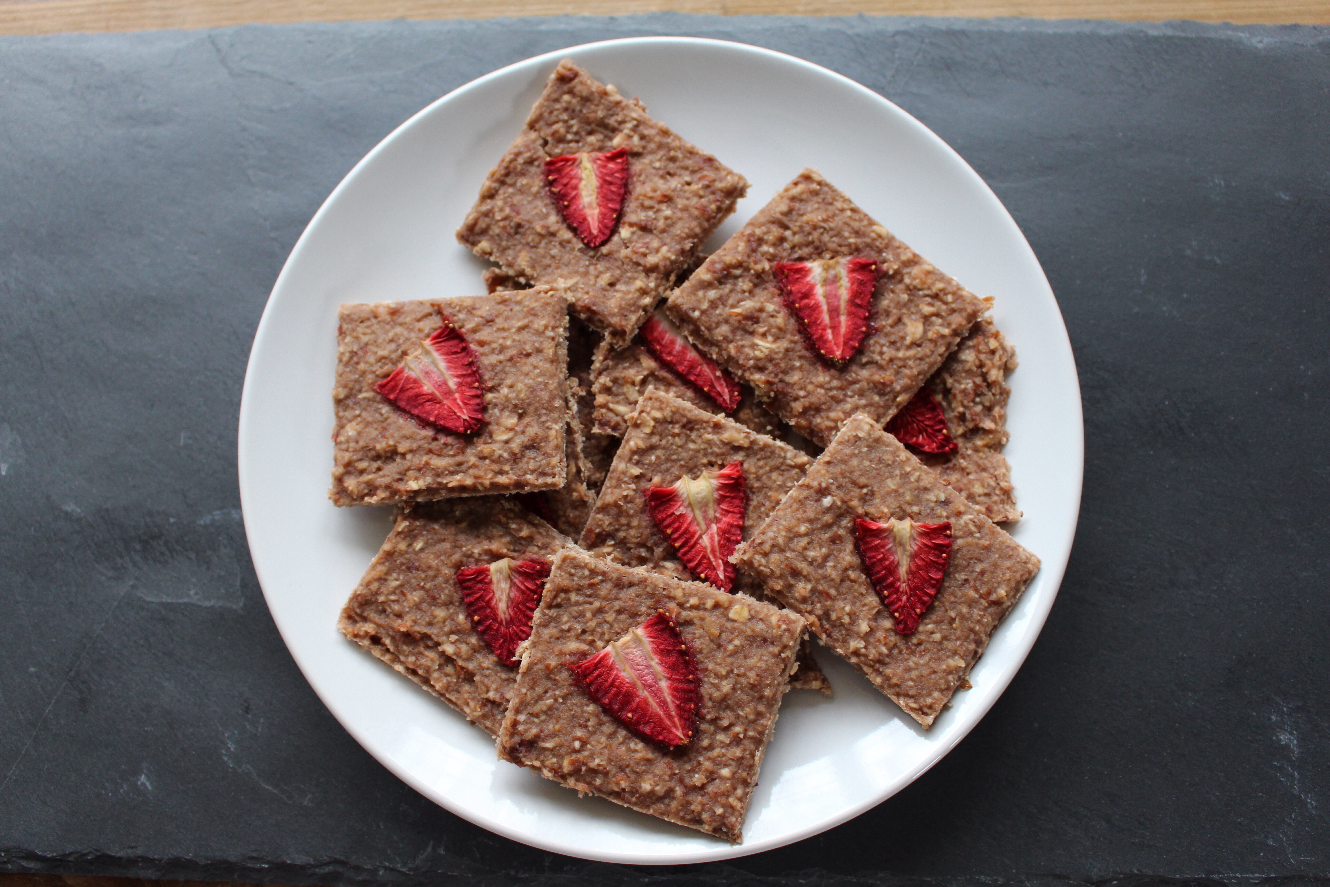 Place the banana, strawberries, coconut nectar and coconut oil in a food processor and blend until smooth. Add the almonds and whizz again until combined. Then stir in the oats. Spread thinly onto non stick sheet on dehydrator tray and score. Place sliced strawberries on top. Take a photo 😉 then put in your dehydrator at around 115 for around 3 hours. Move onto mesh trays and put back in for another few hours. You don’t want these to be too crispy. Once done, refrigerate and serve to little ones with a smile 🙂